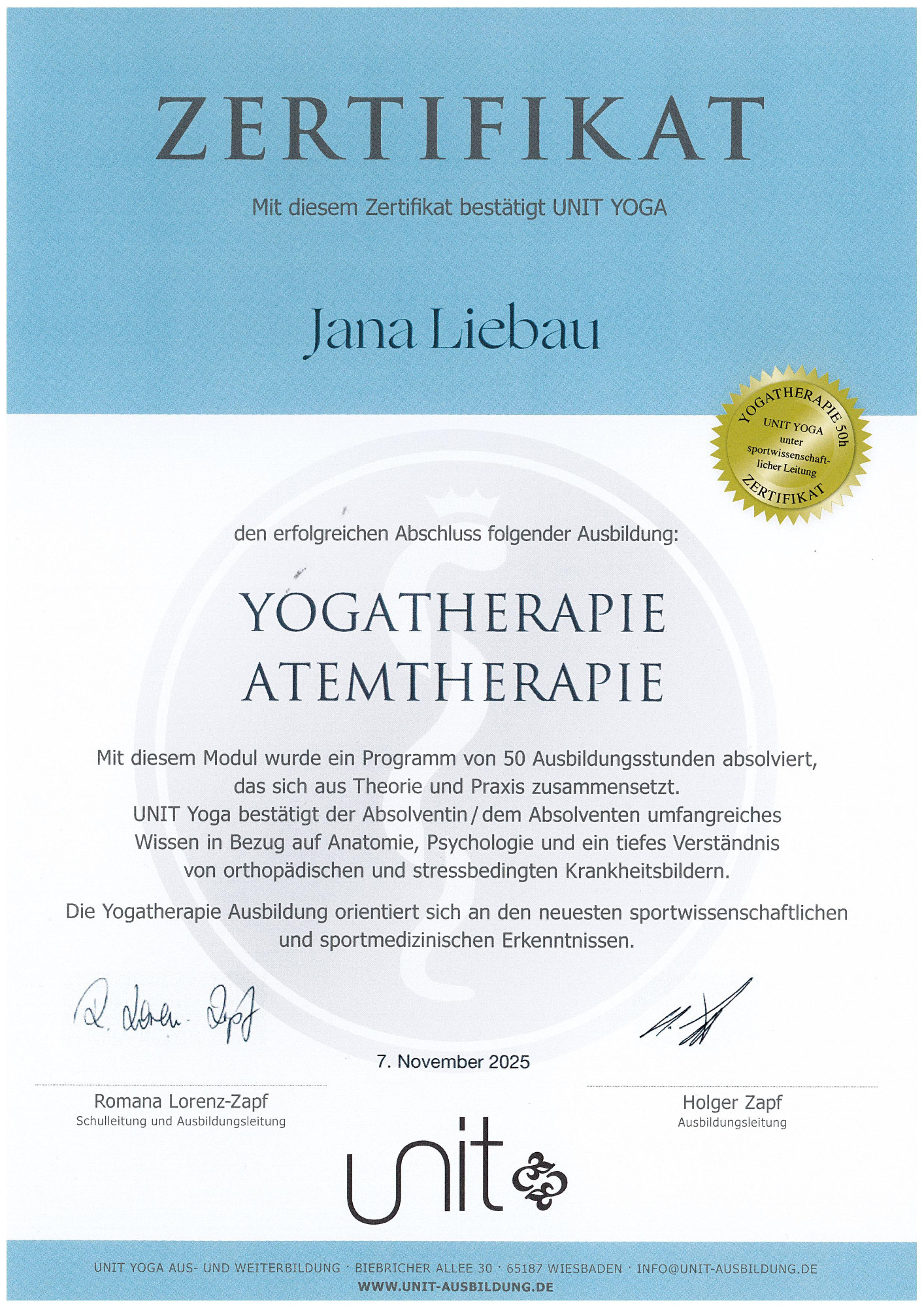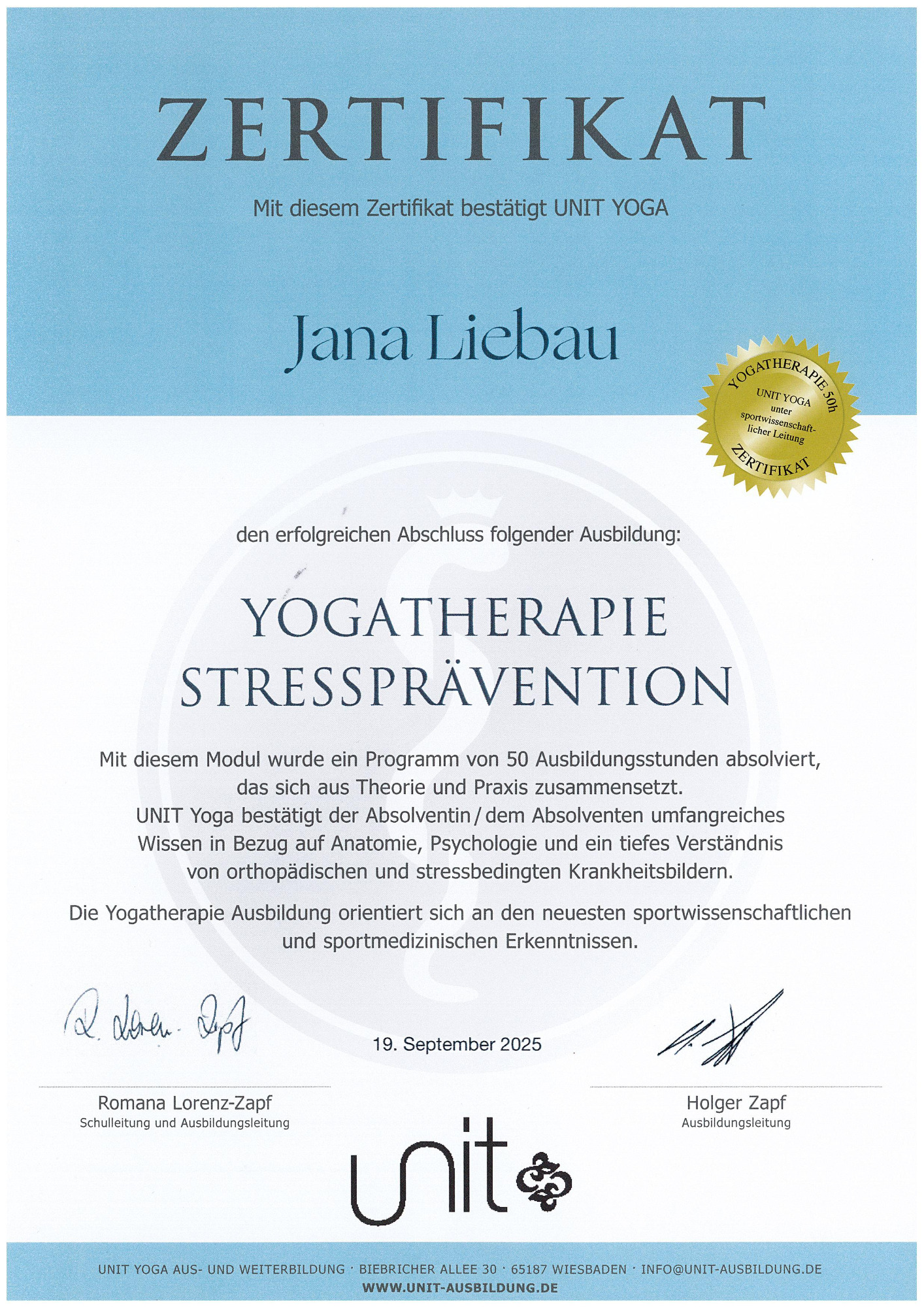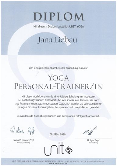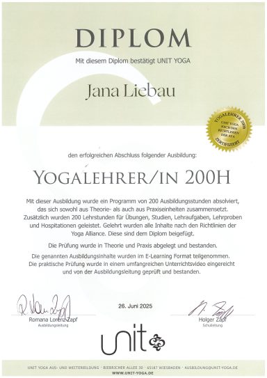 Hallo! Schön, dass du da bist. Ich bin Jana, Yogalehrerin mit einer Ausbildung von 500 Stunden und Yoga Personal Trainerin. Ich lebe mit meiner Familie in Krostitz. Meine Ausbildung mit dem Schwerpunkt auf Yogatherapie habe ich bei Unit Yoga (Wiesbaden, Hamburg) absolviert.